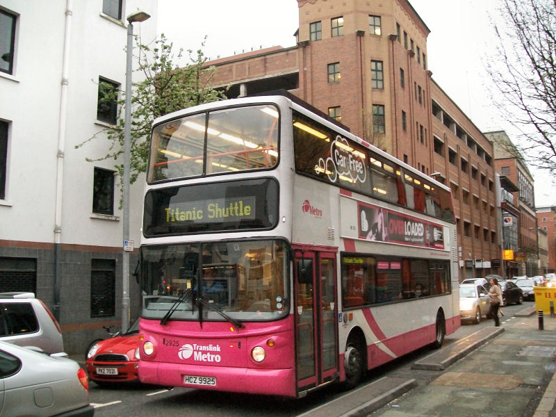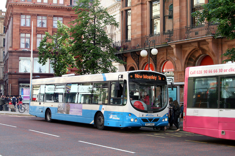 On hire for LOCOG contract: 2335-8/41/2/3/5/6/7/8/53/405/07/12 - Despite the school holidays Metro still seems to be perpetually short of buses, with no less then 4 blue vehicles on core route 1 today (B9TLs 2221/31 and Scanias 493/2477). 493 is hardly a suitable bus for urban operation. Mercedes artics 3100/2 were returned to use on 22nd June at Short Strand to help out with the events transport at the end of the month. Tiger 1476 has returned from Ulsterbus Coleraine and is now back in Reserve, as is Ultra 2729, previously at Falls. Only 4 buses were detaxed for the school holidays, these being Solos 1829-31 and surprisingly Park and Ride branded 1849. A shuffle round of buses at the start of July saw Scanias 792/3 move from Newtownabbey to Short Strand, Ultras 2705 (GVS - Short Strand), 2717 (GVS Active Reserve - Falls), 2718 (GVS - Falls); B9TLs 2208/9 (Falls - Short Strand); B7TLs 2921/2 (Newtownabbey - Short Strand) and 2948-50 (Falls - GVS). Tigers 1474/7 were sold to Dodds, Troon during June.