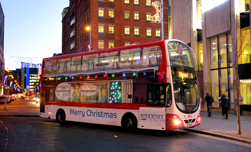 04/12/14 - Solos 1959/60 (TFZ 9959/60 - B28F+9) entered serice at Short Strand on 13th November, and the remaining 5 B5TLs 2196-2200 also at Short Strand on 1st December. A number of B10BLEs have been taken out of use at the end of November: 2774/5/6 (GVS), 2781/2/8 (Falls), 2791/2 (Short Strand), along with B7TLs 2921/32 (Short Strand). Also detaxed with yet another engine fire is B9TL 2334. B7TL 2935 has been reactivated and has gone to Ulsterbus Newcastle. On the move are 1913/4/5/2383/4 (Short Strand - GVS), 739 (GVS - Falls), 2177/8/9 (Newtownabbey - Short Strand), 2190/2388/9/2969 (Short Strand - Newtownabbey), 2185/6/7/2943/5 (Falls - Short Strand), 2385/6/8/2895/6 (Short Strand - Falls), 2393/4 (GVS - Short Strand). B9TL 2202 has received another stylish Christmas advert for Phoenix Gas. New route 4X commenced on 1st December, running from the City Centre to Dundonald Park and Ride, with the first stop being Ballyhackamore.